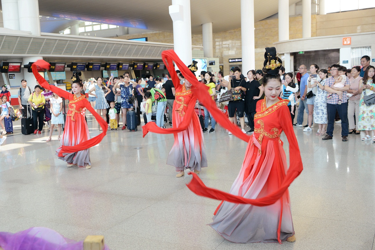 8月7日是中國傳統節日七夕節,在T1出發層9號門旁舉辦了“愛在七夕”傳統文化活動。活動融入了“鵲橋”、“乞巧”等傳統民俗文化元素,身著漢服的“許仙”、“白娘子”為旅客演繹了杭州經典地域元素——“白蛇傳”,并與旅客開展了“紙鶴傳情”和“佳藕天成”等互動游戲,營造了浪漫溫情、內涵豐富的航站樓文化氛圍。