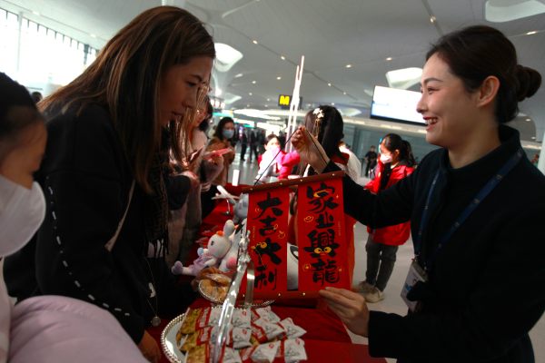 為契合元旦新年主題,活動現(xiàn)場邀請了交響樂團演奏《歡樂頌》《藍(lán)色多瑙河》《小夜曲》《天空之城》等經(jīng)典曲目。同時,活動聯(lián)合長龍航空、貴賓公司與旅客展開投壺、漢服秀等形式的互動,贈送紅色圍巾、對聯(lián)、福字等小禮品。
