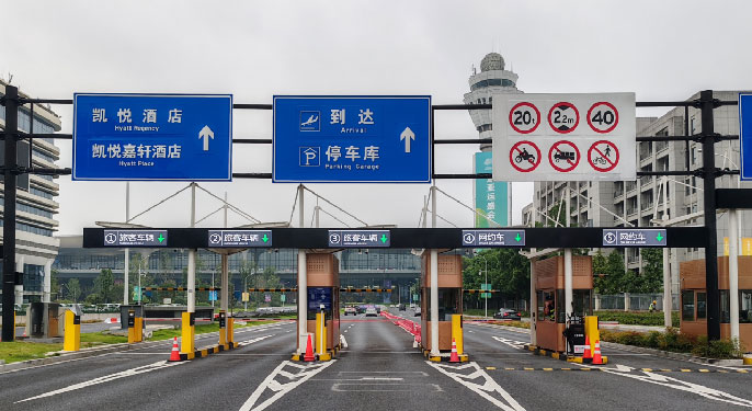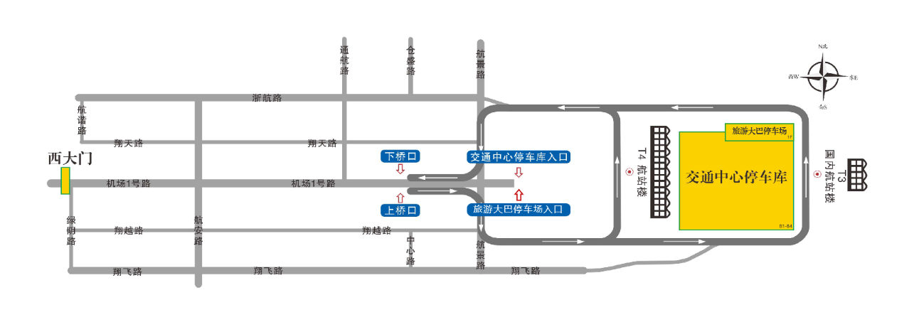 交通中心停車庫(近端):該停車庫位于交通中心B1-B4層。可沿機場1號路左側地面道路直行進入。