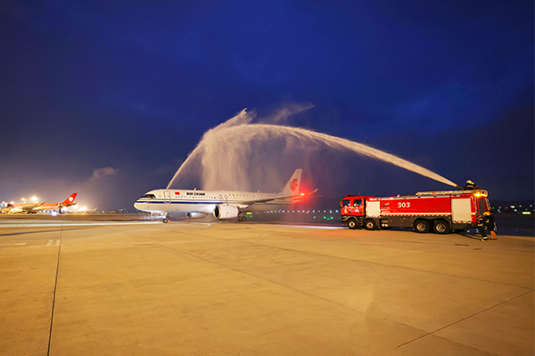 9月11日,杭州機場迎來首個國產大飛機C919執(zhí)飛的商業(yè)載客航班,公司黨委副書記邵勇敏出席儀式現場。18:32,從北京飛抵杭州的CA1722航班搭載150名旅客,緩緩穿過“水門”,滑入410機位。