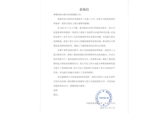 3月5日,地勤公司收到馬來西亞亞洲航空(長途)公司發來的感謝信,信中感謝2日晚在D7307航班保障中地勤公司憑借專業能力與敬業精神,使原本可能拉卸的3塊貨板、4365KG貨物成功出運。